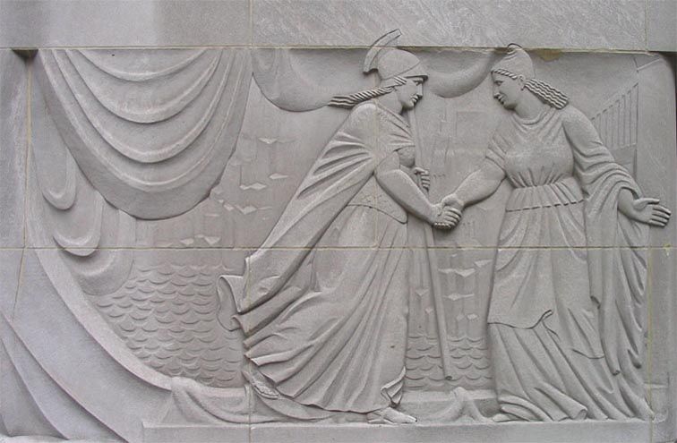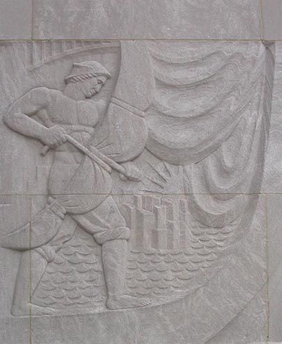 These two panels are part of the three pieces Lee Lawrie created as an appeal for world peace. The other is Swords Into Plowshares. The allegorical scene of the New World features Columbia, the feminine symbol of America, welcoming an immigrant to America. Columbia’s soft felt liberty cap derives from caps worn by newly liberated slaves of ancient Rome. The rising Rockefeller Center skyscrapers in the background reinforce the New World. The adjacent panel features a muscular boatman standing on a ship, focused on his work; the ship is the means to freedom.