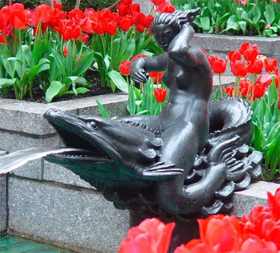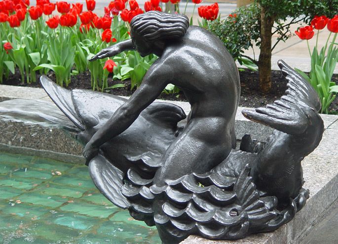 Amongst the greenery of the Channel Gardens are six fountainhead sculptures gushing broad streams of water. The large female fountainheads are the gentle mermaids Nereids, mythological daughters of the benevolent sea god Nereus, while the male figures are Tritons, attendants of the sea gods. Sitting aside fanciful fish, Chambellan’s sculptures are, from Fifth Avenue towards the lower rink, Leadership, Will, Thought, Imagination, Energy and Alertness.