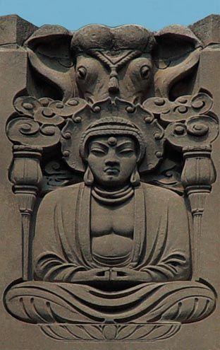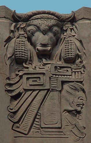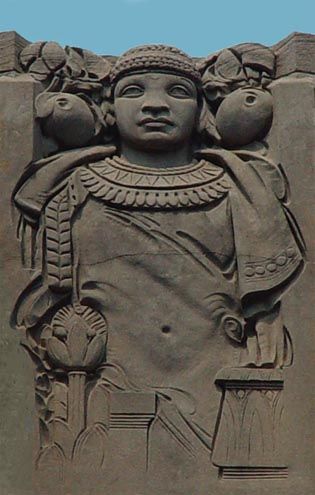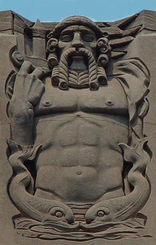 Leo Lentelli’s allegorical carvings of Asia, Europe, Africa and The Americas not only reflect the range of international businesses within the building, but also communicate the vastness and history of the continents. Asia’s serene Buddha symbolizes piety, while its elephant represents strength. Europe’s Neptune and accompanying dolphins are bold, stylized and symbolic of exploration and trade. Africa shows a dignified figure in native dress, with an authoritative scepter. The Americas is represented by a mammoth buffalo head and corn (North America), with a Mayan head and geometric designs (Central and South America).