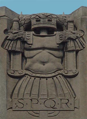 These stone carvings represent four eras in Italy’s history. They begin with The Roman Period, represented by the letters S.P.Q.R. (“The Senate and People of Rome”) and a Roman warrior. The Italian Renaissance bears a carving of the Roman numerals MCCCC (1400), the universally accepted date of the start of the Italian Renaissance, along with a shield decorated with a palette and brushes. Below the two flags in the third carving, Italian Independence of 1870, is the Italian motto for “Death or Liberty”. The Fascist Regime represents the fascist Italian government lead by Benito Mussolini.