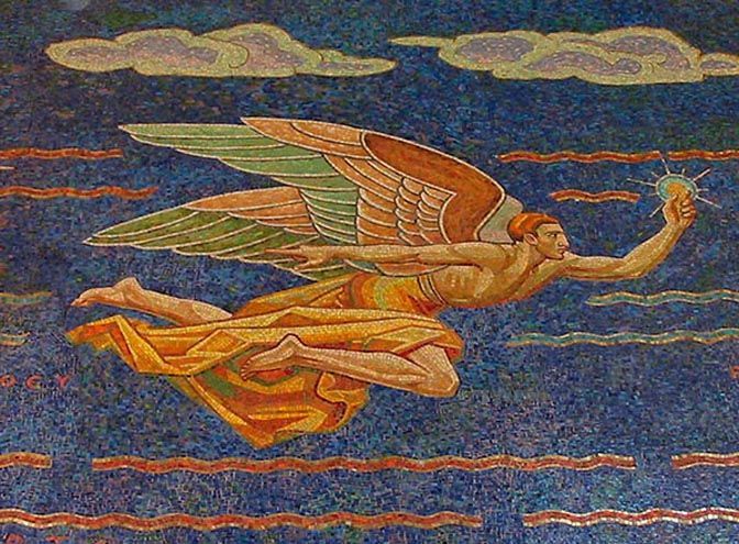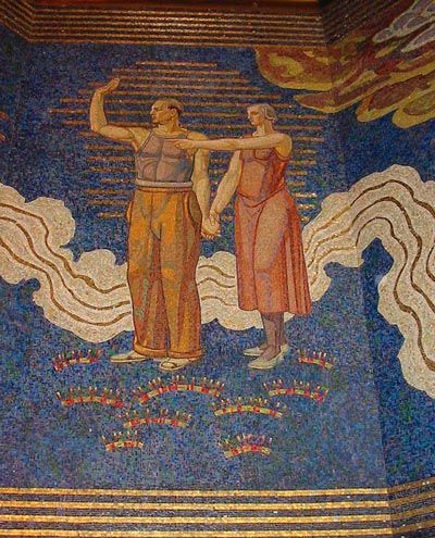 This mosaic of small glass tiles (tesserae) is composed of over one million glass tiles in two hundred and fifty colors, each hand-cut and hand-set. The work is a narrative concerning the triumph of knowledge over the evil of ignorance. The central figure of thought (intelligence) stands above the world, controlling the action in the mosaic; the two other powerful figures in this piece are spoken words and written words. Other figures symbolize creativity, ideas and intellectual efforts. The mosaic’s message is that thought will propagate new knowledge and advance civilization.