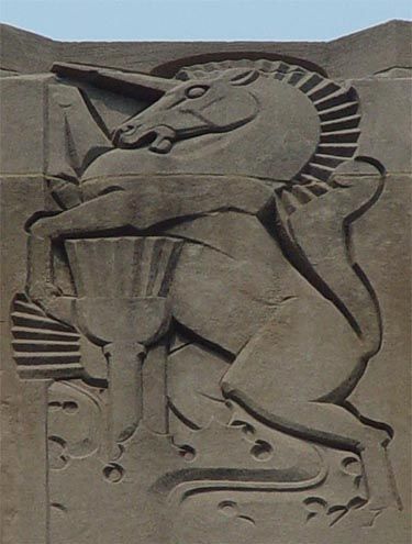 For this series of carvings, Chambellan borrowed motifs from the coats of arms of England, Scotland, Wales and Ireland—the four countries that make up the British Isles. The carvings help publicize the government of Great Britain, the building’s primary tenant at the time. They symbolize what is royally, historically or mythologically significant in each country: Wales is a mighty dragon; England is a lion and large Tudor rose; Scotland is a unicorn and outsized thistle; Ireland is an elegant stag with harp and shamrock.