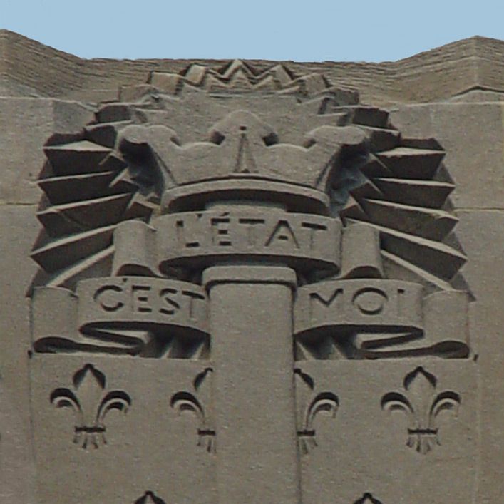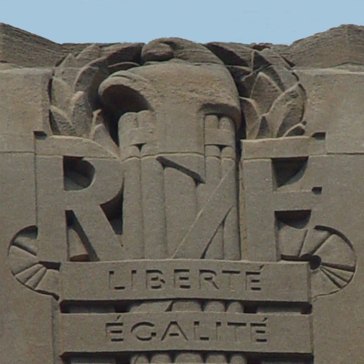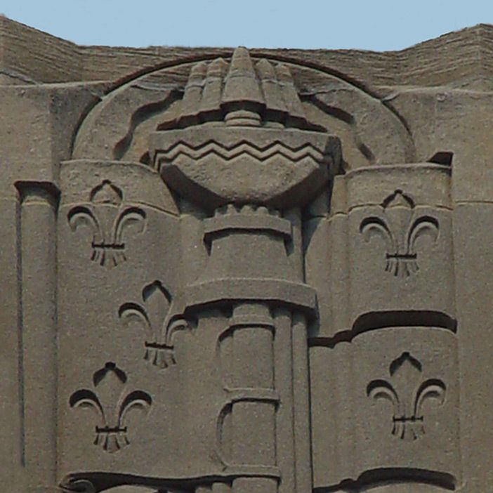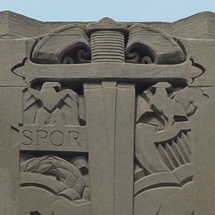 Symbols from four significant events in France’s history illustrate the themes of A Pageant of French History. The Roman Period features a sword with the letters S.P.Q.R., an abbreviation for “The Senate and the People of Rome”. Five spears symbolize New United France, while a crown atop a torch illustrates Absolute Monarchy Established Under Louis XIV. The fourth spandrel is a tribute to the French Republic, with the large letters RF and three symbols for unity, freedom and victory.